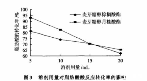 在麥芽糖醇用量為1.0mmol、脂肪酸用量0.5mmol、脂肪酶Novozym 435用量為0.15g,60℃反應(yīng)72h的條件下,考察改變?nèi)軇┍昧繉?duì)反應(yīng)的影響,結(jié)果如圖3所示。
