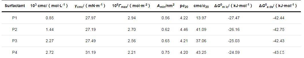 利用ΔG0a ds和ΔG0m ic表征表面活性劑的熱力學性質。P1,P2,P3和P4的ΔG0a ds和ΔG0m ic均小于0,說明表面活性劑在氣/液界面層上的吸附行為以及在水溶液中形成膠束的行為是自發進行的。4種表面活性劑的ΔG0a ds均小于ΔG0m ic,表明表面活性劑分子在溶液中會先形成吸附層,當氣/液界面吸附達到飽和狀態后才開始在溶液內部形成膠束聚集體。