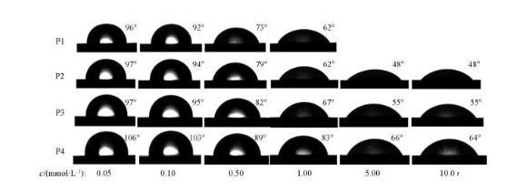 由圖2可知,P1,P2,P3和P4的cmc分別為8.51×10-4,1.44×10-3,2.27×10-3和2.72×10-3 mol/L;γcmc分別為27.97,27.19,27.49和31.19 mN/m.可見,隨著聚氧乙烯鏈長度的增加,4種非離子Gemini表面活性劑的cmc逐漸增加,這是由于隨著聚氧乙烯鏈長度的增加,表面活性劑的疏水作用減弱,不利于膠束的形成。γcmc隨著聚氧乙烯鏈長度的增加先減小后增加,其中P2的γcmc最低,為27.19 mN/m,這可能是由于P2分子內部的親水性和疏水性達到了平衡,能穩定排列在氣/液界面上,降低表面張力的能力最強。P2,P3和P4的γcmc隨著聚氧乙烯鏈長度的增加逐漸升高,這是由于親水性聚氧乙烯鏈長度的增加使得表面活性劑分子在水溶液中卷曲程度增大,在界面處占據的空間增大,降低了分子在界面上的鋪展緊密度,從而導致γcmc升高。