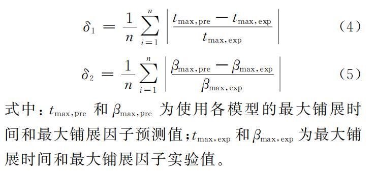 利用表1中的模型,對(duì)乙醇液滴沖擊過冷水平壁面的最大鋪展時(shí)間和最大鋪展因子進(jìn)行預(yù)測(cè),并采用相對(duì)平均偏差δ為評(píng)價(jià)指標(biāo),衡量不同公式的預(yù)測(cè)效果