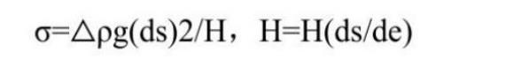 在(25±0.1)℃下使用光學(xué)測量儀,使用注射器注射液體呈現(xiàn)出最大直徑de的液滴時,通過L-Y方程計算液體的表面張力σ的大小。對于每個溶液的表面張力值計算四次測量的平均值,以減小實驗誤差,表面張力(mN/m)的計算如下面所示:
