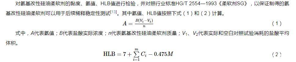 對氨基改性硅油柔軟劑的黏度、氨值、HLB值進(jìn)行檢驗(yàn),并對照行業(yè)標(biāo)準(zhǔn)HG/T 2554—1993《柔軟劑SG》,以保證制得的氨基改性硅油柔軟劑可以用于后續(xù)稀釋穩(wěn)定性測試。其中氨值、HLB值按照下式(1)和(2)計算。