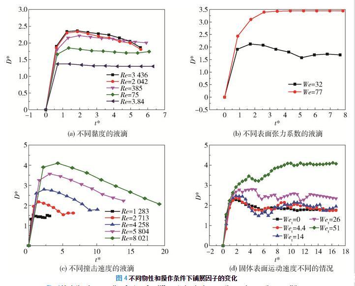若一個具有初始球形當量直徑D0以及初始面積S0的液滴在撞擊過程中經過鋪展時間t后的鋪展直徑為D,鋪展面積為S,且此時鋪展線速度為U,則定義相應的無量綱鋪展因子D*、無量綱鋪展速度U*、無量綱鋪展面積S*和無量綱鋪展時間t*分別為