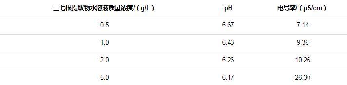2.1.1三七根提取物水溶液的pH和電導率