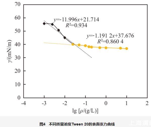 測量不同質量濃度的Tween 20水溶液的表面張力,并繪制表面張力(γ)對質量濃度(ρ)的對數曲線如圖4所示。將轉折點兩側的擬合直線外延,相交點的質量濃度為0.026 g/L,因此下文將Tween 20的cmc計為0.025 g/L,對應的γcmc為40.1 mN/m。Tween 20的c20為0.005 g/L,因此pc20為2.301,cmc/pc20為0.011,在水溶液中更易形成膠團。