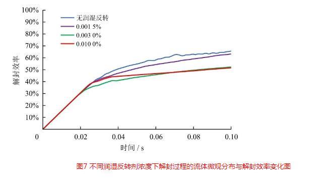 圖7不同潤濕反轉劑濃度下解封過程的流體微觀分布與解封效率變化圖
