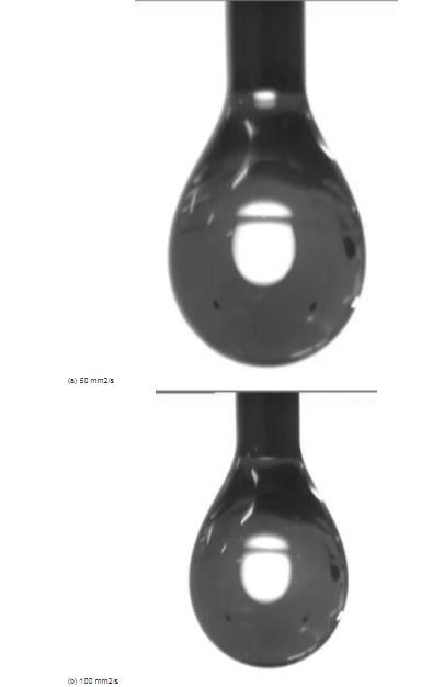 根據液滴的形成過程,實驗選用液滴下落前的臨界懸停狀態圖像,進一步測量了不同黏滯性硅油的表面張力系數,圖4為黏度系數為50、100、350和500 mm2/s硅油樣品的懸滴形態照片。