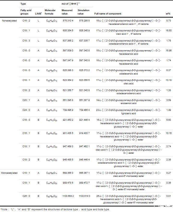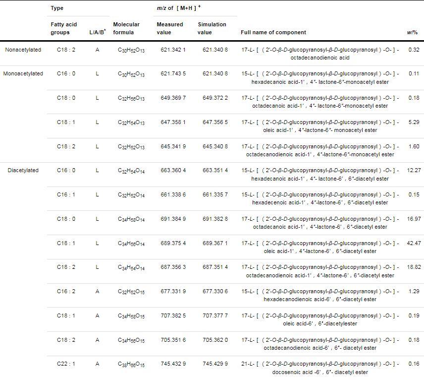 表1、表2和圖3分別顯示了乙酰化SLs和去乙酰化SLs的同系物組分及3種有代表性的同系物結構圖,從表中可以看出,乙酰化SLs的親水基主要為雙乙?;幕碧?,雙乙?;M分高達92.50%;疏水基以十八碳的疏水基為主,其中十八烯酸疏水基質量分數為47.95%;內酯類型的SLs質量分數為97.86%。去乙?;疭Ls同系物中的疏水基中十八烯酸質量分數最高,達到27.87%,親水基主要為去乙酰化的槐糖,質量分數為90.56%,即使發酵菌株被敲除了乙?;P鍵基因,該產物中仍然有9.44%的單乙?;碧侵?,可能胞內存在其他低效率的乙?;緩剑唧w原因有待進一步研究。去乙?;疭Ls同系物中含有內酯型、酸型和bola型SLs,質量分數分別為26.99%、49.98%和23.03%;而乙?;疭Ls同系物中以內酯型為主,質量分數達到97.86%,酸型同系物質量分數為2.14%,未發現bola型SLs。這是由于乙?;疭Ls菌株和去乙?;疭Ls菌株對底物的代謝途徑和效率不同。乙酰轉移酶基因AT的敲除使大部分SLs分子不再發生乙?;?。在去乙酰化SLs產品中bola型SLs分子質量分數高達23.03%,與Saerens等的研究結果一致。
