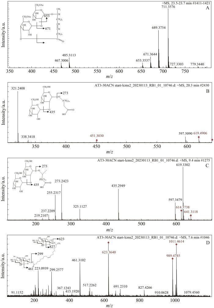 圖2(A)乙酰化SLs保留時間為23.6 min組分的質譜圖.(B)去乙?;疭Ls保留時間為20.3 min組分的質譜圖.(C)去乙酰化SLs保留時間為9.4 min組分的質譜圖.(D)去乙?;疭Ls保留時間為7.6 min組分的質譜圖