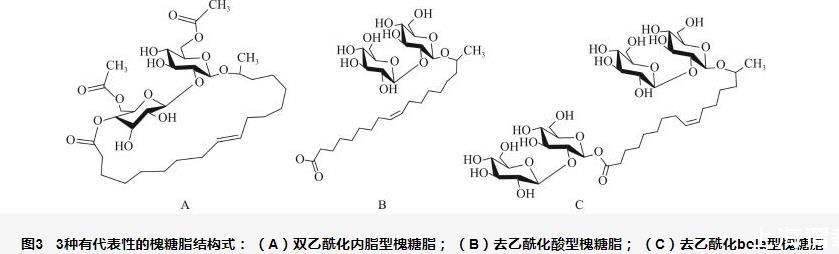 圖3 3種有代表性的槐糖脂結構式:(A)雙乙?;瘍戎突碧侵唬˙)去乙?;嵝突碧侵?;(C)去乙?;痓ola型槐糖脂
