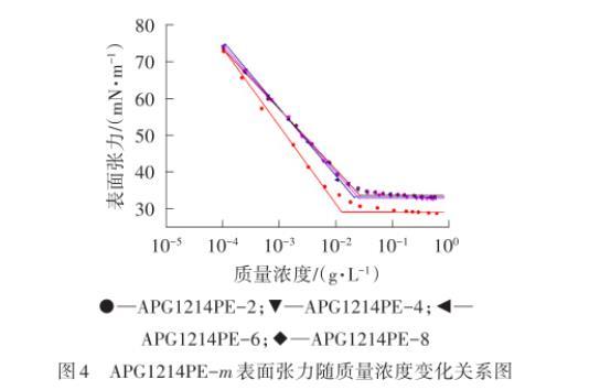 平衡表面張力揭示了表面活性劑降低溶劑(通常是水)表面張力的能力。表面活性劑的許多應(yīng)用都與平衡表面張力有關(guān),例如起泡作用、潤(rùn)濕作用、鋪展作用等。圖2為APG0810PE-n和APG0810平衡表面張力隨著質(zhì)量濃度變化的關(guān)系圖,圖3、圖4為APG1214PE-m和APG1214平衡表面張力隨著質(zhì)量濃度變化的關(guān)系圖,相應(yīng)的物化性能參數(shù)列于表3。