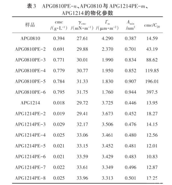 由表3可以看出,APG0810PE-n的cmc、γcmc、Amin均高于APG0810,且隨著PO添加量的增加而增大,PO基團(tuán)的引入增加了分子的空間位阻以及被吸附分子在氣/液界面所占的面積。因此,Гm會(huì)隨之降低,并且隨著PO基團(tuán)的增加降低得更明顯。同樣,對(duì)于APG1214PE-m也有相同的趨勢(shì)。