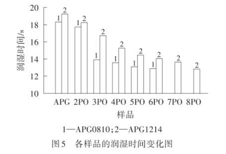 由圖5可以看出,APG0810PE-n和APG1214PEm的潤(rùn)濕時(shí)間隨著PO加合數(shù)的增加而減少。這是因?yàn)楸砻婊钚詣┰跐駶?rùn)帆布片時(shí),PO基團(tuán)的引入為分子提供疏水性,提高了分子與帆布片之間的疏水相互作用,促使分子易于吸附在帆布片表面,有利于潤(rùn)濕。而APG1214和APG1214PE-m的潤(rùn)濕時(shí)間比APG0810和APG0810PE-n長(zhǎng),說(shuō)明隨著碳鏈增長(zhǎng),潤(rùn)濕性能變差,這是因?yàn)榉肿娱L(zhǎng)度增加打破了親水親油平衡狀態(tài),不利于潤(rùn)濕。