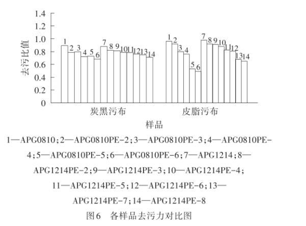 污垢通過(guò)不同的相互作用力在物品表面附著,而應(yīng)用表面活性劑去除的污垢一般是通過(guò)物理吸附(范德華力、偶極相互作用)或者靜電作用而附著于物品上。去污力是指將固體表面浸泡在一定的液體介質(zhì)中去除污垢的能力,使用洗滌劑減少污垢在固體表面的附著量,利用機(jī)械力使污垢與固體表面分離。由圖6可以看出,無(wú)論是皮脂污布還是炭黑污布,制備的APG0810PE-n和APG1214PE-m的去污比值都低于對(duì)應(yīng)的原料APG0810和APG1214,而且隨著PO加合數(shù)的增加而降低,可能是由于PO基團(tuán)的引入使得分子的疏水性提高。但整體來(lái)看,PO改性APG獲得的產(chǎn)品去污性能仍處于較好的水平。