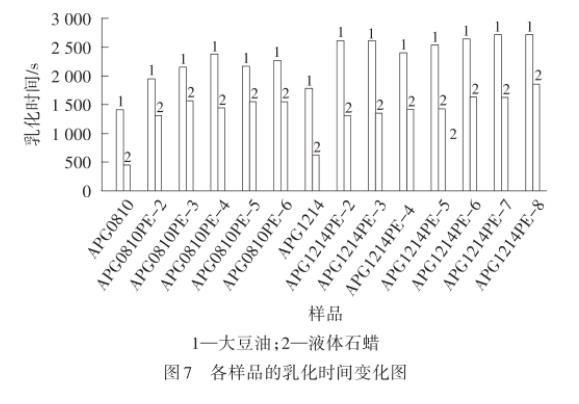 由圖7可以看出,采用乳液破乳時(shí)間表征表面活性劑的油水界面性質(zhì),APG1214和APG1214PE-m乳化大豆油以及液體石蠟的能力勝于APG0810以及APG0810PE-n,而且隨著PO加合數(shù)的增加而提高。這是由于PO基團(tuán)和烷基鏈增長(zhǎng)提供了疏水性,增強(qiáng)了乳化劑分子的乳化能力,延長(zhǎng)了破乳時(shí)間。此外,所有表面活性劑乳化大豆油的能力均明顯強(qiáng)于乳化液體石蠟,表明PO基團(tuán)可能具有類(lèi)似極性作用,可以增強(qiáng)樣品與極性分子之間的協(xié)同作用,因此乳化性能更好。
