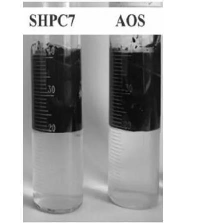 為驗證SHPC7活性劑與其他表面活性劑的性能,通過乳化實驗對SHPC7活性劑與AOS活性劑在乳化方面的乳化性能進行觀察,從而可以得到如圖3的實驗前后效果。
