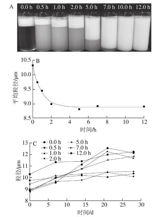 圖5纖維化轉(zhuǎn)變過程中β-乳球蛋白納米纖維穩(wěn)定的乳液外觀(A)、平均粒徑(B)和常溫貯藏時粒徑(C)的變化