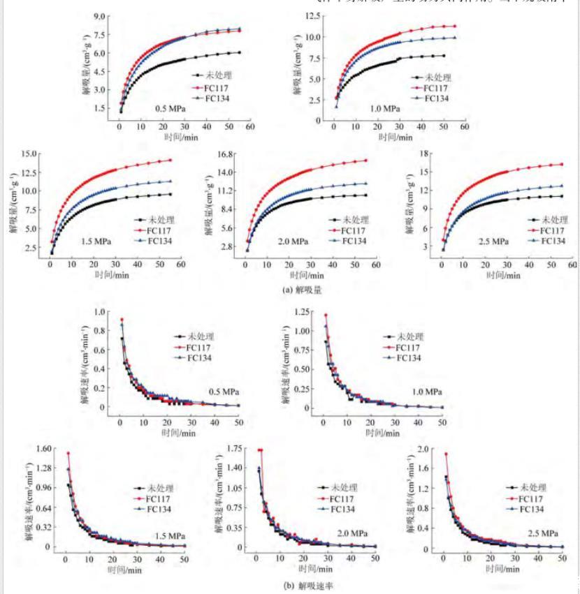 由圖6b可知,隨著甲烷吸附平衡壓力的增加,3種處理方式的含水煤樣解吸速率均有所增加。經(jīng)過氣潤濕反轉劑FC117和FC134處理后的煤樣解吸速率也始終大于未處理的煤樣。其中,表面活性劑FC117處理后的煤樣解吸速率始終保持著顯著的效果。同時,由于水鎖效應產(chǎn)生的影響,不同處理方式的含水煤樣解吸速率均小于干燥煤樣的解吸速率。