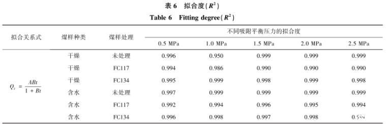 由表6可知,利用王佑安式擬合不同平衡壓力條件下的解吸量與時間關系曲線,得到曲線的擬合度。其中,氣潤濕反轉劑處理前后含水煤樣的擬合效果最好,擬合度均大于0.99。在干燥煤樣中,F(xiàn)C134處理后的煤樣擬合度最好,不同吸附平衡壓力條件下的擬合度均大于0.99;其次是未處理和FC117,擬合度也比較好,除去未處理煤樣中吸附平衡壓力為1.0 MPa,其余均在0.98以上。
