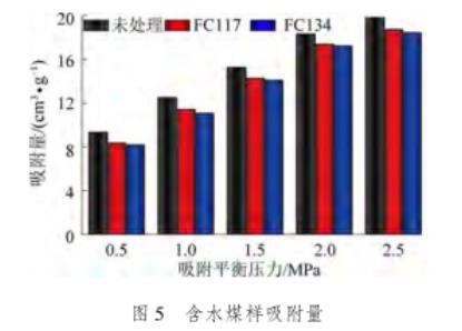 3)通過對氣潤濕反轉劑處理前后煤樣吸附量的計算,對比兩種表面活性劑處理前后的煤樣吸附量變化情況。其中,經(jīng)過FC117和FC134處理后的干燥/含水煤樣均小于未處理煤樣的吸附量。