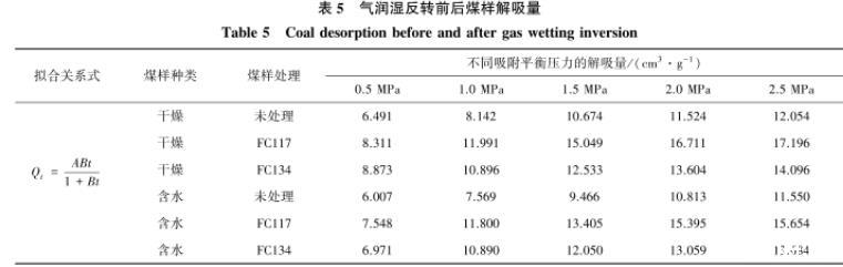 通過對干燥煤樣解吸量和解吸速率的分析,經(jīng)過氣潤濕反轉劑FC117和FC134處理后的煤樣解吸量和解吸速率均有所提升。定量地分析了氣潤濕反轉劑通過物理吸附的方式吸附在煤體表面,降低煤體表面自由能,增加煤樣解吸量,為氣潤濕反轉劑提高瓦斯抽采效果提供理論依據(jù)。