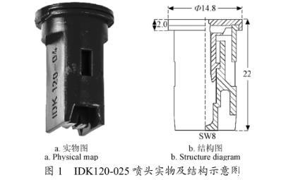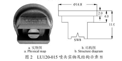 試驗噴頭為德國LECHLER公司生產的空氣誘導噴頭IDK120-025和多量程平面噴頭LU120-015,其結構及尺寸如圖1和圖2所示。