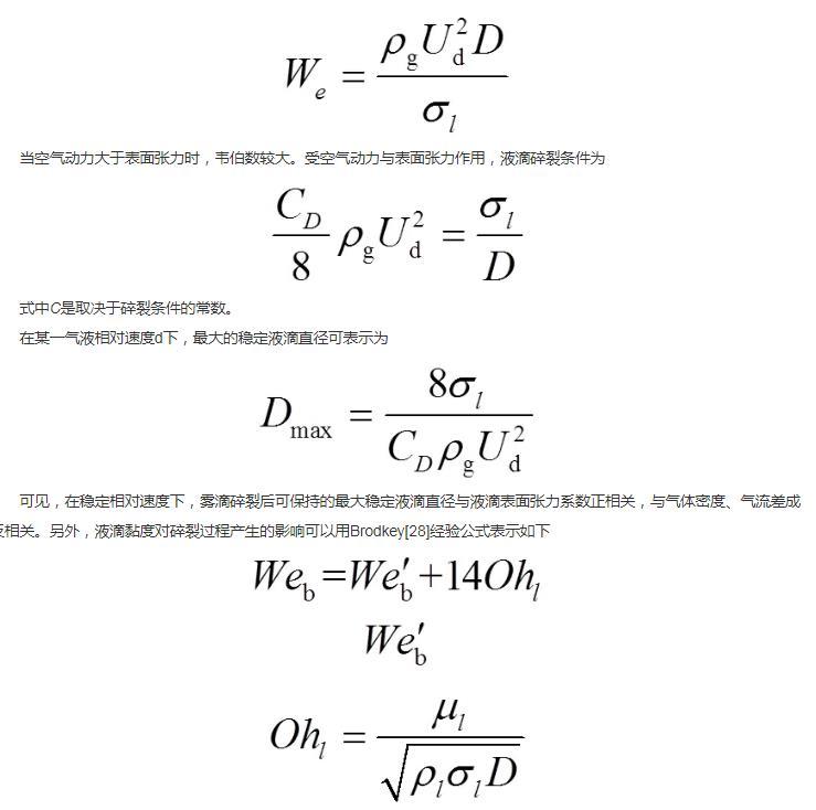 對于低黏度液體,當液滴處在穩定氣流場中,其變形取決于空氣動力(0.5gd2,g是氣體密度,kg/m3;d是氣液流速差,m/s)和表面張力系數與液滴直徑比(1/)。