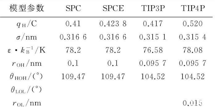 水分子模型很多,如SPC、SPCE、TPI3P和TPI4P等,其結(jié)構(gòu)示意圖和模型參數(shù)分別見圖3和表1。水分子的勢(shì)能函數(shù)如式(1)所示。