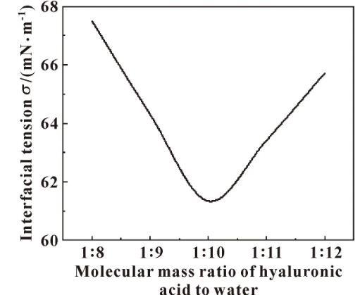 分子動力學(xué)中認(rèn)為界面張力與不同方向上的壓力張量有關(guān),仿生黏液透明質(zhì)酸體系-水的界面張力通過KIRKWOOD和BUFF提出的力學(xué)定義來進(jìn)行計算。通過對5個不同質(zhì)量比的體系在平衡后200 ps的數(shù)據(jù)進(jìn)行統(tǒng)計,得到了一個仿生黏液和水界面的界面張力平均結(jié)果,如圖1所示。可見在研究的質(zhì)量比范圍內(nèi),透明質(zhì)酸仿生黏液與水的界面張力始終保持在(60.00±10)mN/m左右,其中透明質(zhì)酸和水分子的質(zhì)量比接近1∶10時,界面張力最小(為61.33 mN/m)。仿生黏液和水界面的界面張力越小,體系中仿生黏液和水界面的自由能就越低,界面就較穩(wěn)定。因此,可以認(rèn)為在研究的質(zhì)量比范圍內(nèi),質(zhì)量比1∶10時,模擬黏液-水的界面穩(wěn)定性最優(yōu)。這同時也證明,通過分子動力學(xué)模擬的方法可以初步預(yù)測仿生黏液在水體中的穩(wěn)定性。