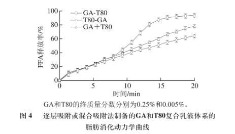 圖4逐層吸附或混合吸附法制備的GA和T80復(fù)合乳液體系的脂肪消化動(dòng)力學(xué)曲線(xiàn)