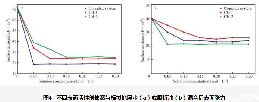 圖1單一表面活性劑體系與模擬地層水(a)或凝析油(b)混合后的表面張力