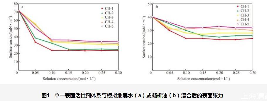 單一表面活性劑(CH-1,CH-2,CH-3,CH-4,CH-5)體系與模擬地層水或凝析油混合后的表面張力測定結果見圖1。