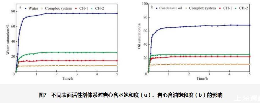 圖7不同表面活性劑體系對巖心含水飽和度(a)、巖心含油飽和度(b)的影響