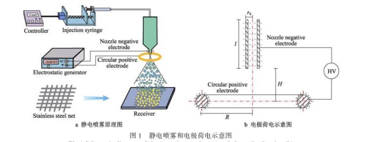 靜電噴霧裝置主要由高壓靜電發(fā)生器、控制器、微量注射器、噴嘴電極、環(huán)形電極和接收板組成,如圖1a所示。噴嘴電極連接高壓靜電發(fā)生器的負極,環(huán)形電極接高壓靜電發(fā)生器的正極。高壓靜電發(fā)生器輸出負高壓,在噴嘴電極會產(chǎn)生大量的負電荷,同時環(huán)形電極上會感應(yīng)出正電荷。調(diào)節(jié)靜電發(fā)生器的參數(shù),控制噴嘴電極和環(huán)形電極之間的電場強度。將微量注射泵固定在支架上,使用微量注射泵將溶液勻速泵送到噴嘴處。液體從噴嘴噴出時與高壓電極接觸,使電極上的電荷傳導(dǎo)到液體。帶電液體在靜電力、電荷互斥力、重力、環(huán)境復(fù)合力的作用下,破碎成細小液滴,并均勻地吸附在工件上。