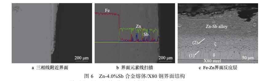 圖6c展示了經硝酸酒精腐蝕后,Zn-Sb合金與X80鋼潤濕的界面反應產物層。利用EDS沿界面進行定量檢測,發現界面處存在一定量的Zn、Fe和極少量的Sb,Zn-Sb合金熔體與X80鋼發生反應生成了鐵鋅化合物。能譜分析表明,圖6c中箭頭所示(1)、(2)處的含鐵量分別為8.30%和5.23%,為典型的δ(FeZn10)相和ζ(FeZn13)相,ζ層緊鄰Zn-Sb合金熔體,而δ層呈柵狀,位于ζ層的下方,這與徐其林等的研究結果一致。同時發現,隨著Sb含量的增加,潤濕反應所形成的界面產物層并未發生顯著變化,說明Sb元素的添加對Fe-Zn反應基本沒有影響。