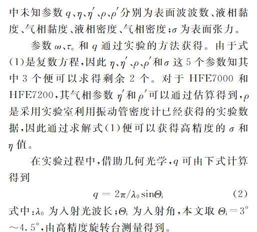 參數(shù)ω、τc和q通過實驗的方法獲得。由于式(1)是復(fù)數(shù)方程,因此η、η′、ρ、ρ′和σ這5個參數(shù)知其中3個便可以求得剩余2個。對于HFE7000和HFE7200,其氣相參數(shù)η′和ρ′可以通過估算得到,ρ是采用實驗室利用振動管密度計已經(jīng)獲得的實驗數(shù)據(jù),因此通過求解式(1)便可以獲得高精度的σ和η值。