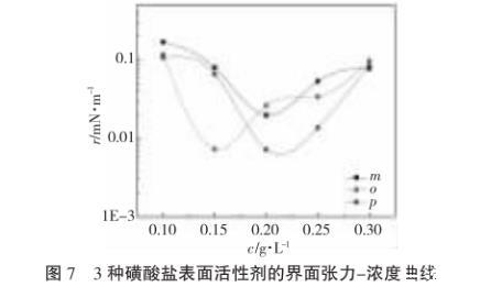 圖7 3種磺酸鹽表面活性劑的界面張力-濃度曲線