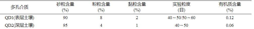 本研究選用的兩種多孔介質(zhì)分別為QD1(表層20~40cm土壤)和QD2(地下50~100cm深層土壤),均采自青島市嶗山區(qū)某農(nóng)田。經(jīng)過自然風(fēng)干后,將其篩分為40~50目和50~60目。實(shí)驗(yàn)選用土壤中的金屬氧化物含量均較低,主要差異為有機(jī)質(zhì)含量。土壤樣品的性質(zhì)見表1。