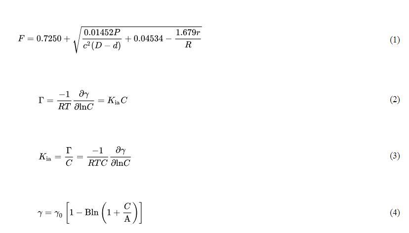 實(shí)際表面張力(γ)由儀器表面張力讀數(shù)(P)、校正因子(F)和實(shí)驗(yàn)相關(guān)常數(shù)相乘得到。校正因子計(jì)算如公式(1)所示;氣-水界面吸附系數(shù)通過Gibbs吸附等溫方程得到,見公式(2)和公式(3);將Szyszkowski方程應(yīng)用于表面張力數(shù)據(jù),見公式(4),該方程提供了一種計(jì)算數(shù)值的統(tǒng)一方法。
