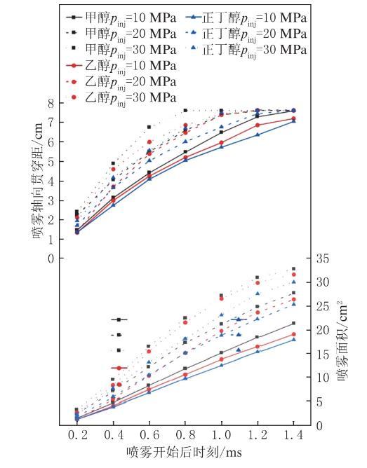 圖2為3種醇類燃料在背壓0.1 MPa、環境溫度20℃時,不同噴射壓力下噴霧開始后時刻0.2至1.4 ms內的噴霧軸向貫穿距和噴霧面積的變化,其中pinj定義為噴射壓力。