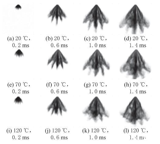 圖4不同環境溫度和噴霧開始后時刻下甲醇的噴霧形態