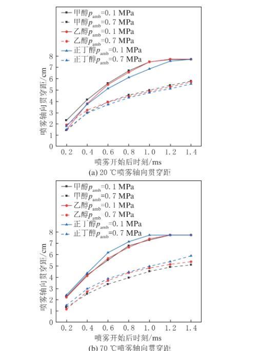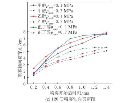在試驗中發現,高溫高壓的環境對噴霧形態產生了較大的改變,相比于單種工況,環境溫度和背壓共同對噴霧形態有著更復雜的影響。圖8為3種醇類燃料在不同溫度(20℃、70℃、120℃)、不同背壓(0.1 MPa、0.7 MPa)的環境下,噴射壓力為20 MPa時的噴霧軸向貫穿距的變化。