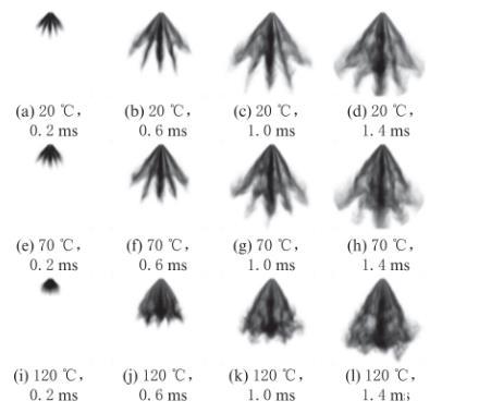 圖6不同環境溫度和噴霧開始后時刻下正丁醇的噴霧形態