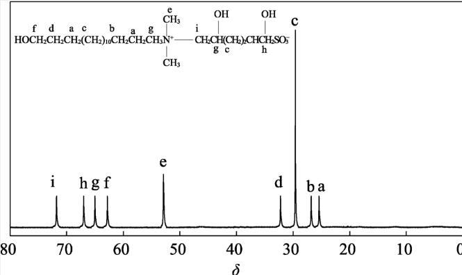 圖3為TAC的13 CNMR譜圖。從圖3可以看出,δ25.6(a)為—CH 2—中C sp 3的共振吸收峰;δ26.8(b)為—CH 2—中C sp 3的共振吸收峰;δ29.6(c)為—(CH 2)10—中C sp 3的共振吸收峰;δ32.2(d)為—CH 2—中C sp 3的共振吸收峰;δ52.9(e)為CH 3—N—CH 3中C sp 3的共振吸收峰;δ62.8(f)為—CH 2—OH中C sp 3的共振吸收峰;δ65.0(g)為—N—CH 2—中C sp 3的共振吸收峰;δ67.0(h)為—CH 2—SO–3—中C sp 3的共振吸收峰;δ71.8(i)為—N—CH 2—中C sp 3的共振吸收峰。