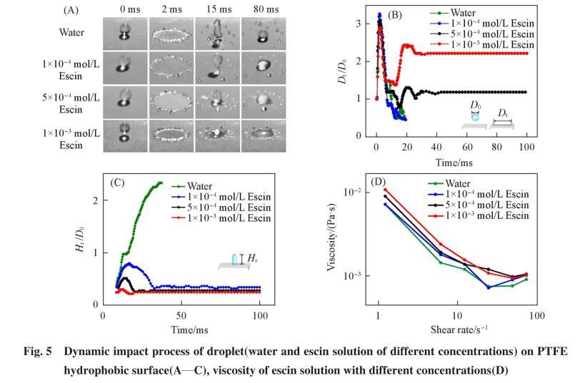 液滴在固體表面的彈跳行為由液體性質和固體表面性質共同決定,通常對于特定場景,固體表面性質多是固定不變的,因此主要通過改變液體的性質(黏度、表面張力)來調控液滴的彈跳行為.為了考察七葉皂素抑制液滴回縮過程中,液體黏度是否起到一定作用,測定了水和不同濃度七葉皂素溶液的黏度.如圖5(D)所示,所有樣品的黏度隨剪切速率的增加會先下降后達到平衡,不同樣品的黏度結果相似,無明顯差異。