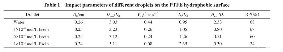 從圖5(B)和(C)及表1可以看出,不同液滴在疏水表面上發生撞擊后均發生相似程度的鋪展,之后發生回縮.水滴回縮速率(0.44 m/s)較大,且回縮百分比達到68%.向水中加入少量七葉皂素,濃度為1×10-4mol/L時,回縮速率(0.26 m/s)明顯降低,但回縮百分比沒有明顯改善.隨著七葉皂素濃度增大,液滴回縮明顯減弱.濃度為1×10-3mol/L時,回縮速率低至0.08 m/s,且僅液滴的24%發生回縮,可以認為達到了很好的抑制回彈的效果.而考察彈跳情況時發現,水滴因完全彈起離開表面,所以Hmax/D0最高達到2.33.與之相比,七葉皂素加入后,明顯抑制了液滴的彈起,且隨著濃度增大,抑制作用明顯增加.