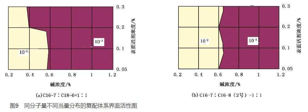 2)同分子量不同當(dāng)量分布的表面活性劑界面活性范圍從圖8和圖2對(duì)比可以得出,表面活性劑平均相對(duì)分子量為432時(shí),C18-6測(cè)得表面活性劑與堿濃度范圍很寬的超低界面活性范圍,而C16-8(2號(hào))超低界面活性范圍的堿濃度相對(duì)于C18-6變窄。同理,在試驗(yàn)用表面活性劑的復(fù)配體系中,試驗(yàn)圖9表明平均相對(duì)分子量為425時(shí),C16-7與C18-6的復(fù)配體系形成超低界面活性范圍寬于C16-7與C16-8(2號(hào))的復(fù)配體系。說明平均相對(duì)分子量相同當(dāng)量分布不同的表面活性劑界面活性范圍也不相同。