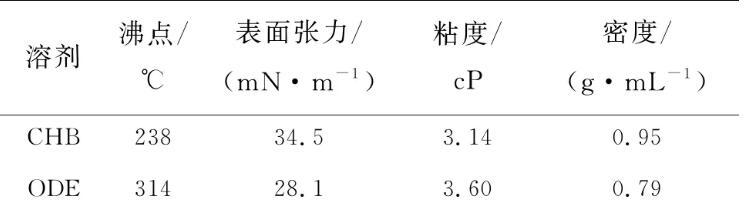 表1為CHB和ODE的沸點、表面張力等物理參數,在選擇量子點溶劑時,利用了雙溶劑體系增強馬蘭戈尼流的基本原理。CHB是一種沸點較低、表面張力較高的溶劑,而ODE則是沸點高、表面張力低的溶劑,可以有效地增強自外而內的馬蘭戈尼流;同時兩種溶劑的粘度都較低,并且對量子點都有較好的溶解性。