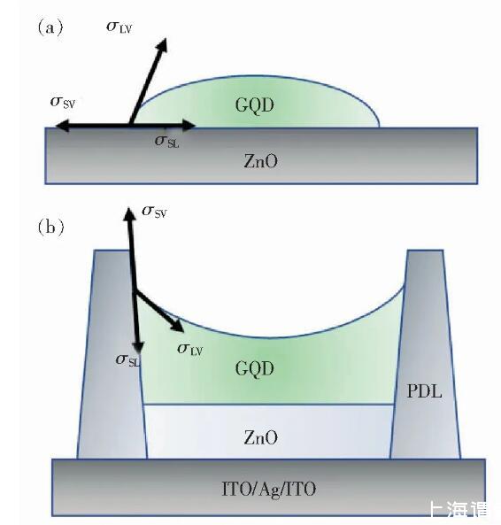 圖2量子點墨水在ZnO襯底上的接觸角示意圖。(a)墨水在平坦ZnO襯底上的接觸角示意圖;(b)墨水在旋涂了ZnO的像素坑基板接觸角示意圖。
