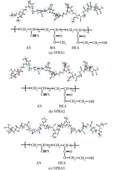 利用美國Accelrys公司Materials Studio軟件建立NPBA分子模型時(shí),NPBA1聚合單元AN、MA和HEA的數(shù)目分別為20、5和5,NPBA2聚合單元AN和HEA的數(shù)目分別為20和10,NPBA3聚合單元AN和HEA的數(shù)目分別為28和7,NPBA分子模型上各類聚合單元均為隨機(jī)分布。此時(shí)3種NPBA分子模型的摩爾鏈節(jié)比分別為4∶1∶1、2∶1和4∶1,且相對分子質(zhì)量均為2 300左右,使得所構(gòu)建的模型與實(shí)際物質(zhì)具有較好的對應(yīng)關(guān)系。